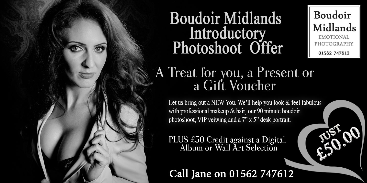 We do get booked up well in advance for Bridal Boudoir, Christmas and Valentine’s day so it’s always best to allow at least 3 weeks from the time of your shoot until you need your pictures. We only take one shoot a day 3 days a week so we are at our creative best for you. Boudoir clients visit from the Midlands, Worcestershire, Staffordshire, Shropshire, Warwickshire, Herefordshire and Gloucestershire.